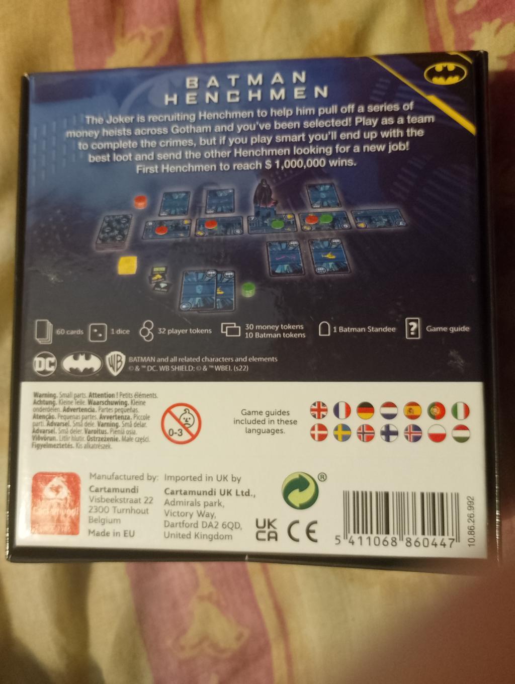 22/08/2025 14:34 | Description | oker recrute des hommes de main pour l'aider à réaliser une série de braquages d'argent à Gotham et vous avez été sélectionné ! Jouez en équipe pour commettre les crimes, mais si vous jouez intelligemment, vous obtiendrez le meilleur butin et enverrez les autres hommes de main à la recherche d'un nouvel emploi ! Le premier homme de main à atteindre 1 million de dollars gagne Jeu de cartes à rôle caché. Jeu de 2-4 joueurs. Si achats en lot, possibilité de diminution des frais de livraison. |