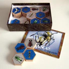 Hive First Edition utilized wooden pieces with metallic shiny stickers in silver and blue.