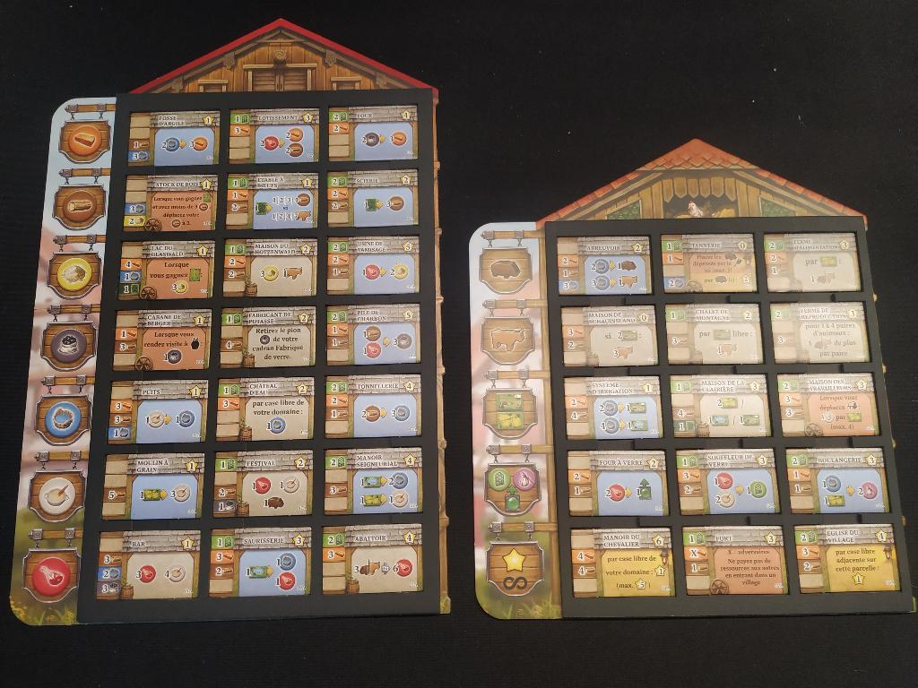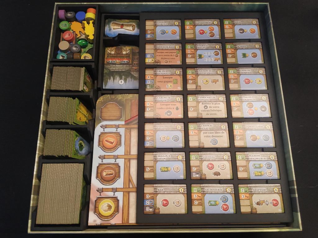 Le jeu est fourni avec un insert en carton plume fait maison qui permet une mise en place rapide (présentoirs à bâtiments) et un rangement à la verticale.
