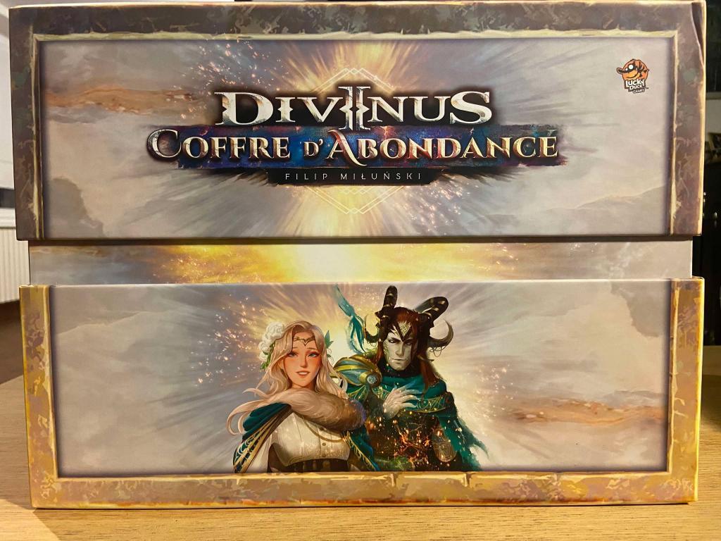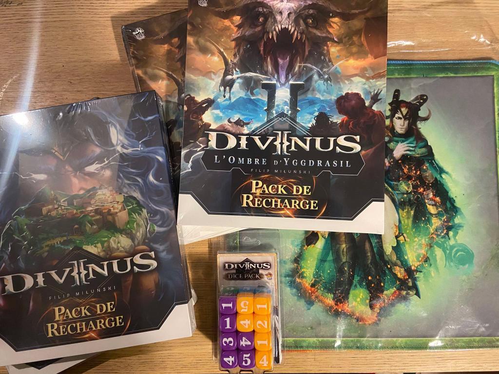 Divinus Coffre d'abondance version KS, avec un pack de réinitialisation pour le jeu de base et deux pour l'extension, 4 tapis de jeu et un set de dés supplémentaire.
