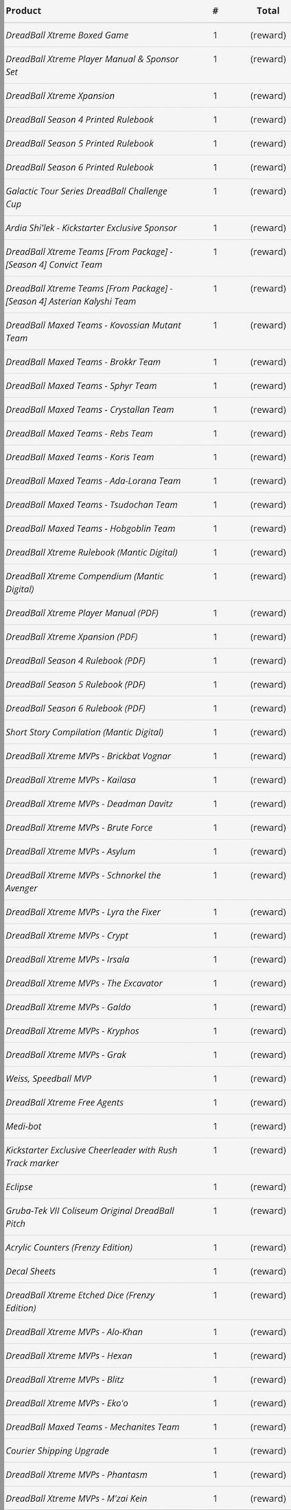 03/09/2025 15:07 | Description | intégrale strictement exhaustive de tout ce qui existe pour ce jeu, impossible de faire plus complet, à savoir l'édition Kickstarter complète "frenzy" level, contenant ceci: Valeur de base environ 500 euros - 241 minis total - Dreadball base game - Dreadball Xtreme boxed game. ($75 RRP) - Dreadball Player Manual - Xtreme sponsors set. - Xtreme multiplayer expansion (with customizable pitch and 3 giants) - KS exclusive Ardia Shi'lek ($10 RRP) - Stretch goal rewards (listed below) - 8 extra Asterian minis. ($15 RRP) - 8 extra Convict minis. ($15 RRP) - 4 extra Asterian/Convict prones - Brickbat Vognar MVP ($5 RRP) - Chovar Psychozoan, Giant ($10 RRP) - Kailasa, Asterian MVP ($5 RRP) - Asylum, Convict MVP ($5 RRP) - 5 extra Free Agent minis ($8 RRP) - Dead Man Davitz, Plague MVP ($5 RRP) - Brute Force, Mechanite MVP ($5 RRP) - Lyra the Fixer, MVP ($5 RRP) - Crypt, Crystallan MVP ($5 RRP) - Irsala, Sephalin MVP ($5 RRP) - Galdo, Rebs Kraaw MVP ($5 RRP) - The Excavator, Brokkr MVP ($5 RRP) - Schnorkel the Avenger, Elastopod MVP ($5 RRP) - Kryphos, Koris MVP ($5 RRP) - Acrylic Counter set ($15 RRP) - 16 Plague Mutants ($25 RRP) - 16 Robots ($25 RRP) - 16 Crystallans ($25 RRP) - 16 Sphyr ($25 RRP) - 16 Rebs ($25 RRP) - 16 Forgefather Brokkrs ($25 RRP) - 16 Koris ($25 RRP) - 14 Hobgoblins ($25 RRP) - 16 Tsudochans ($25 RRP) - 16 Ada-Lorena ($25 RRP) - Hector Weiss, Speedball MVP ($10 RRP) - Frenzy dice ($10 RRP) - ODB rubber mat ($20 RRP) - Dreadball Challenge Cup, 4 minis ($25 RRP) - Medibot ($5 RRP) - Minx, turn counter cheerleader ($5 RRP) |