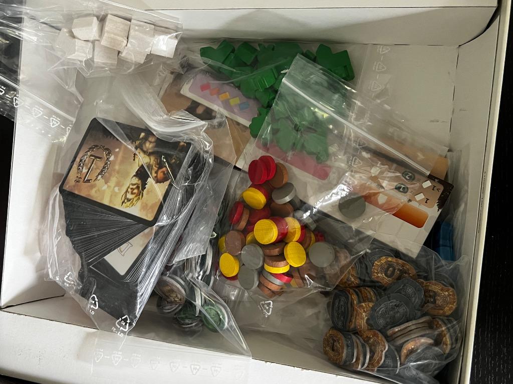 Tout est rangé dans des sachets, tuiles en parfait état, la boîte légèrement gondolée avec le temps.