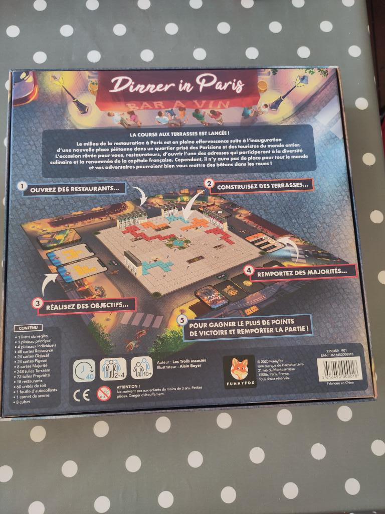Dans Dinner in Paris, ouvrez des restaurants, construisez des terrasses, réalisez des objectifs, remportez des majorités pour gagner le plus de points de victoire et remporter la partie !