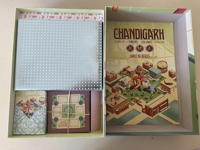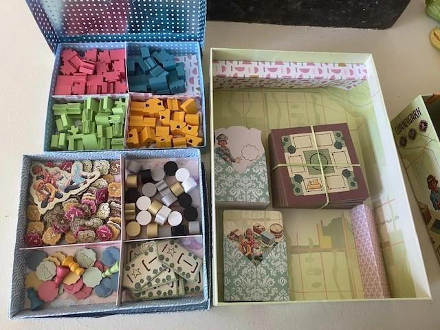 Avec rangements en origamis bien optimisé. Facilite la mise en place, le rangement et agréable pendant la partie. Faits maison.