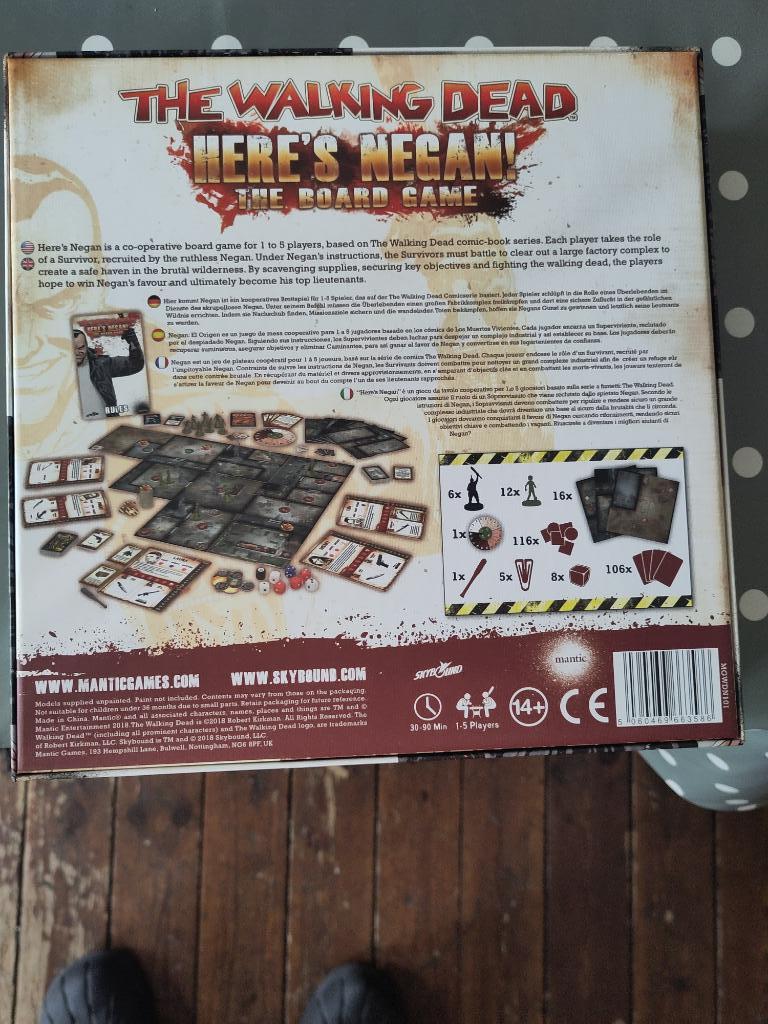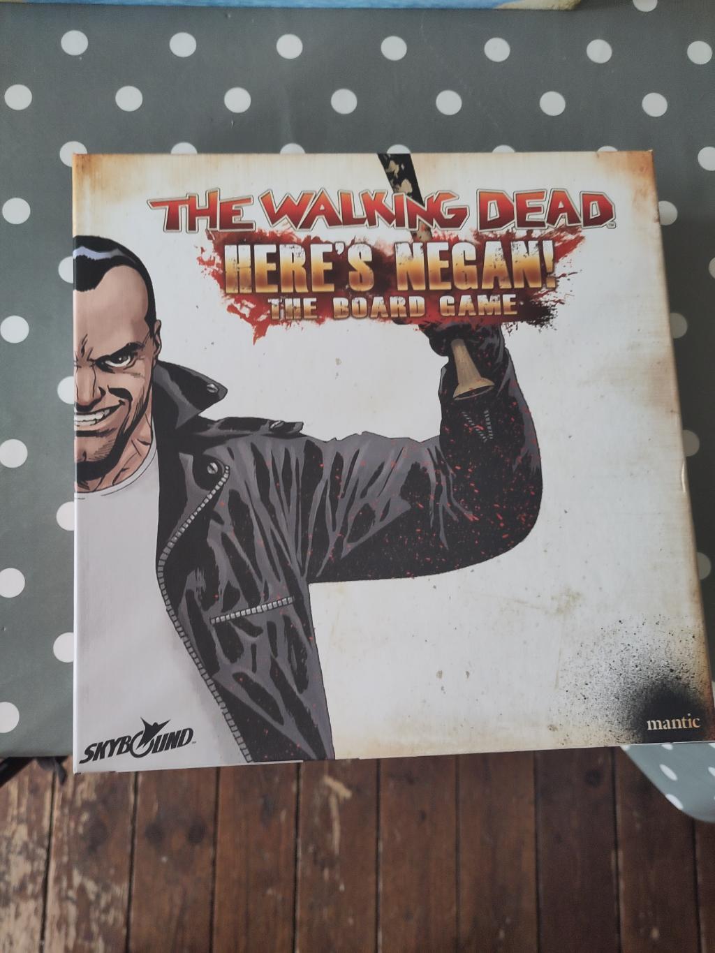 Here's Negan est un jeu de plateau coopératif qui désignera cependant un vainqueur. Il est conçu pour un maximum de cinq joueurs car vous serez en compétition avec vos camarades survivants pour gagner le plus de points de réputation. Le montant de la réputation accumulée déterminera le succès d'un groupe à la fin d'une mission, mais le joueur avec le plus de points de réputation sera déclaré favori de Negan !