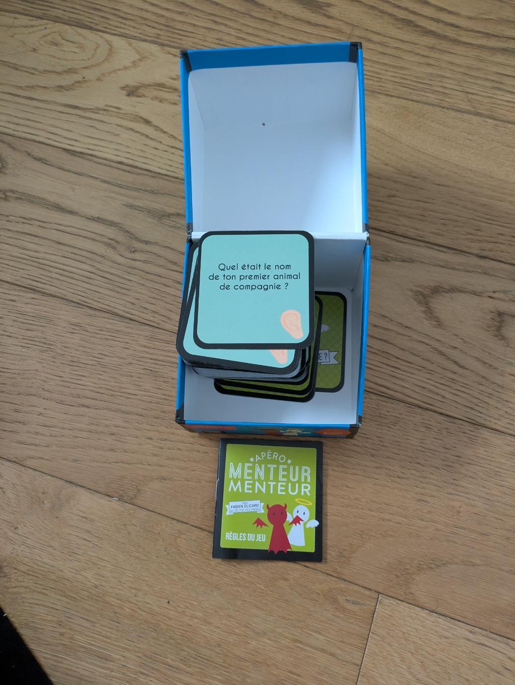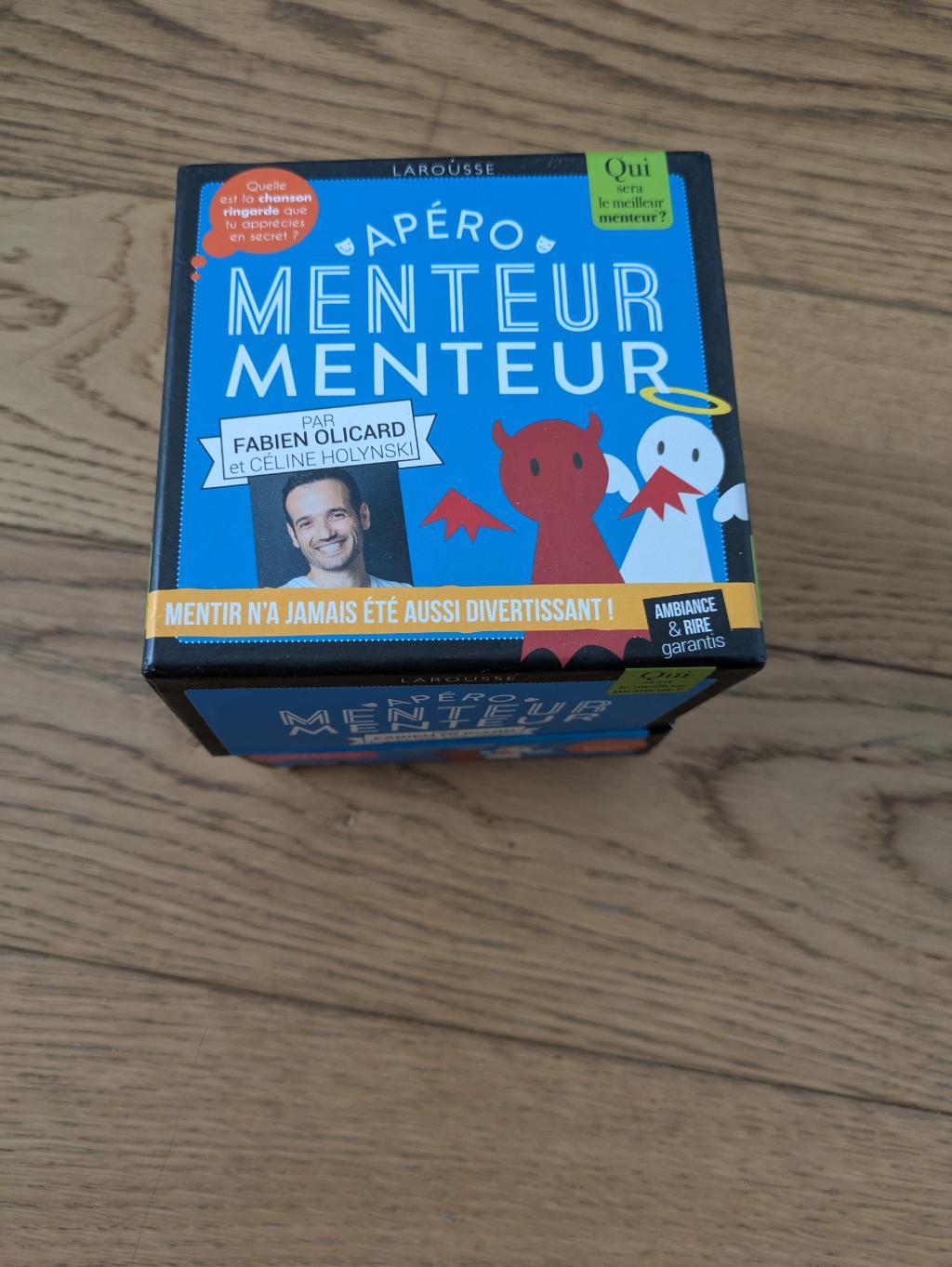 Menteur menteur de Fabien Olicard. La boîte est un peu abîmée (tordue) mais les cartes sont en parfait état.
