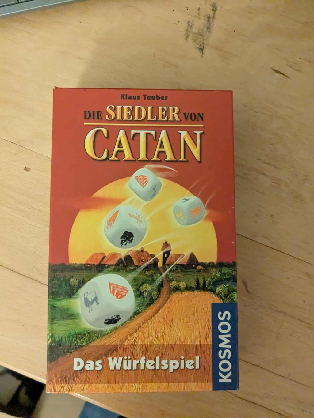 Jeu'Vous venez d'accoster sur l'île de Catane. Vous allez l'explorer en fondant des colonies et des villes et en recrutant des chevaliers. C'est le principe du Yam's, adapté au monde créé par Klaus Teuber : Il y a 6 dés à 6 faces, chaque face comportant les 6 symboles du jeu éponyme : bois, argile, céréales, minerai, laine, or. Le joueur actif lance les dés et essaye de faire des combinaisons pour construire des éléments de sa fiche de score : route, colonie, ville ou chevaliers. Il peut faire jusqu'à 3 lancers, avec tout ou partie des dés. Deux ors servent de jokers, et on peut utiliser les ressources des chevaliers préalablement cochés. Une fois ses constructions faites, c'est au tour du joueur suivant.'