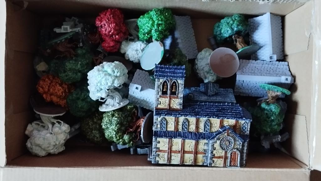- des figurines (bâtiments, arbres, piétaille...), des socles et des dés en plus