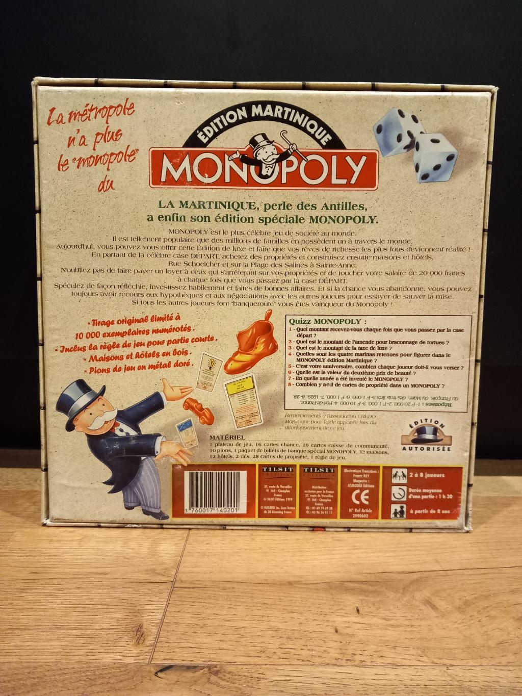 Ce Monopoly est une édition rare et localisée, dédiée à la Martinique. Publié par Tilsit en 1999, il s’agit d’une série limitée et numérotée. Le numéro de mon exemplaire est le 02773.