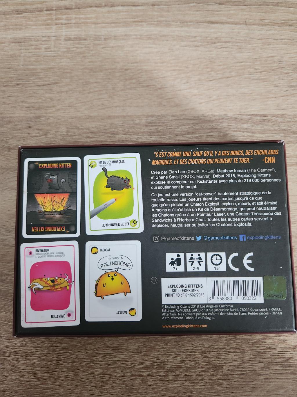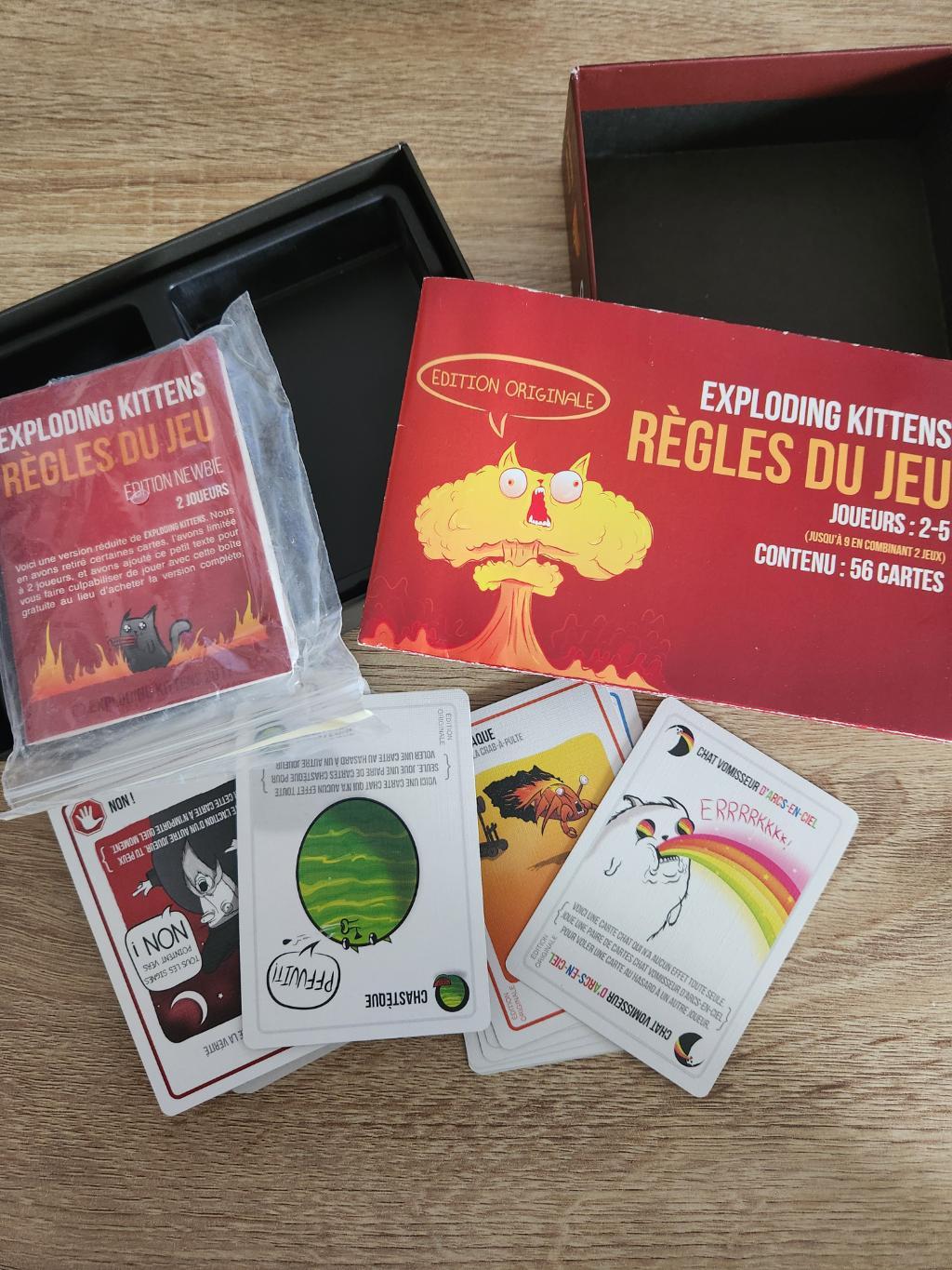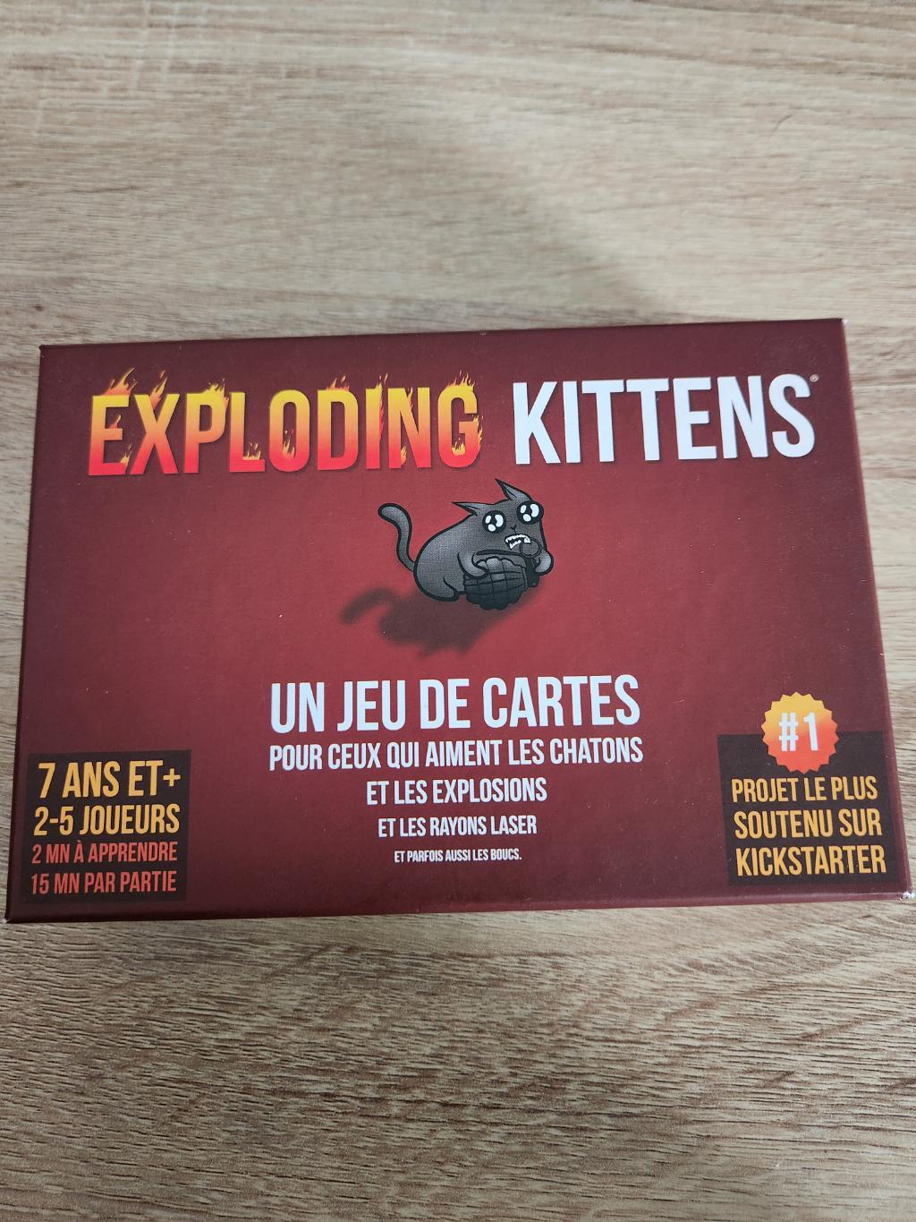 Jeu Exploding Kittens, bon état, jeu de deck façon roulette russe avec des chats.