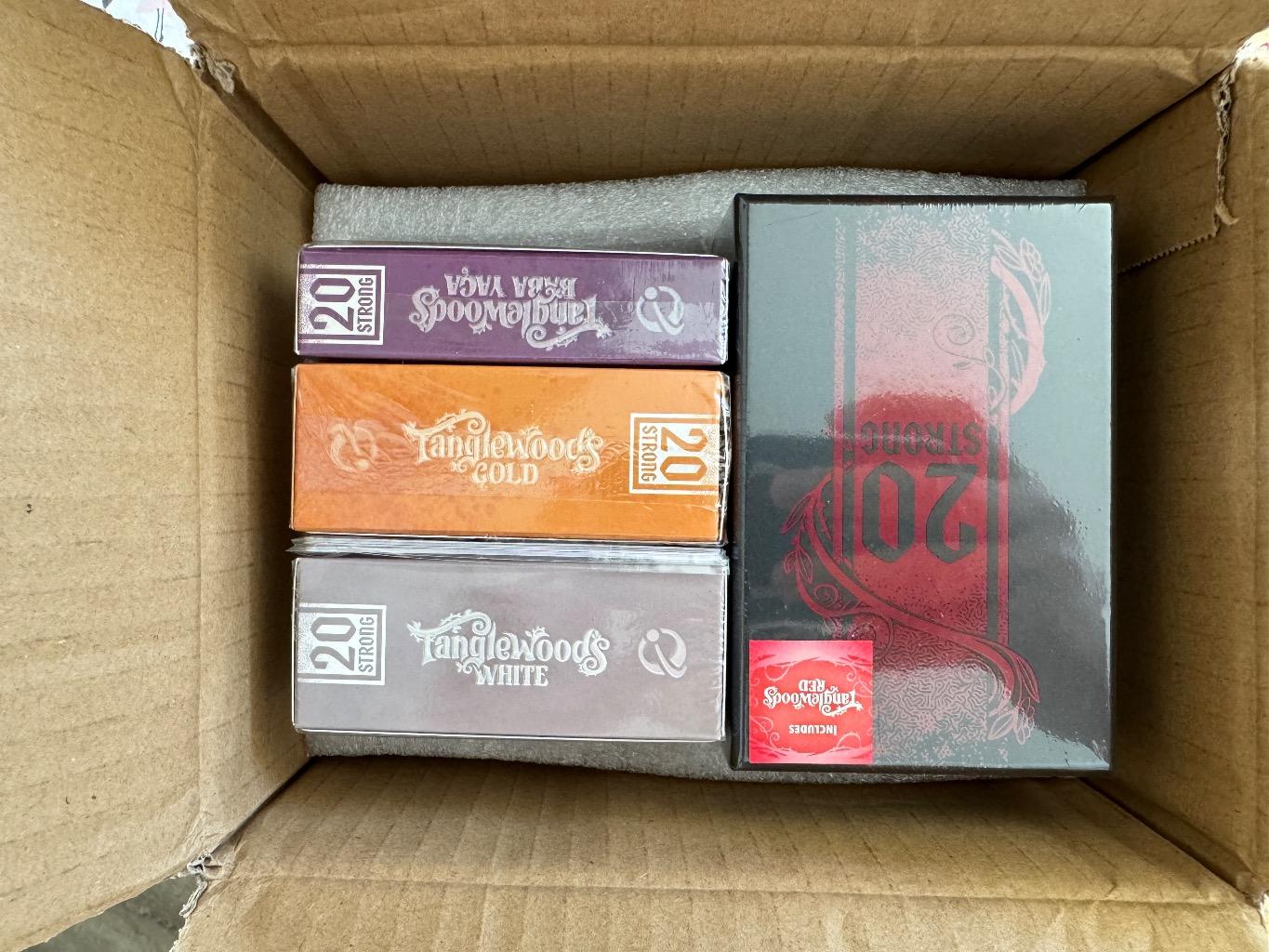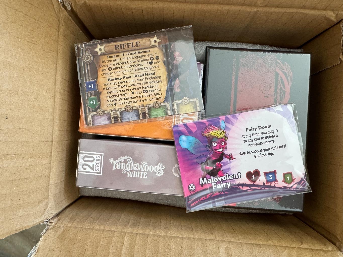 À cause d’une erreur lors du pledge, j’ai reçu deux fois 20 strong tanglewood et ses extensions, ainsi que les cartes promo. Premier arrivé, premier servi :-)