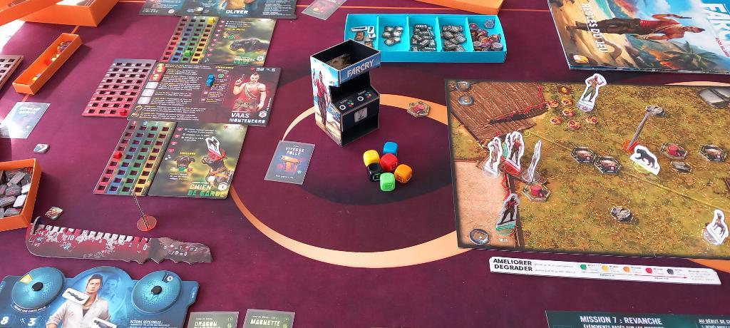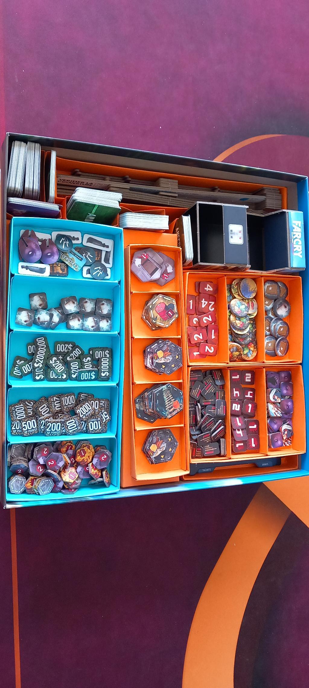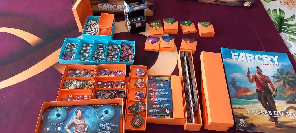 Jeu complet en français vendu avec des boîtes origami pour faciliter le rangement et la mise en place.