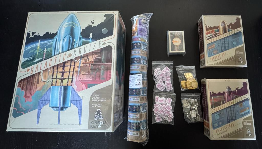 Jeu + Extension - Heavy BundleJe vends le superbe jeu Galactic Cruise en Heavy Bundle en VF, c'est-à-dire le jeu de base (un beau bébé de 5,5kg!), les 2 extensions Innovations et Adaptations, le tapis de jeu en néoprène, les pièces en métal, les jetons acryliques et les sleeves. Tout est sous cello et en parfait état.