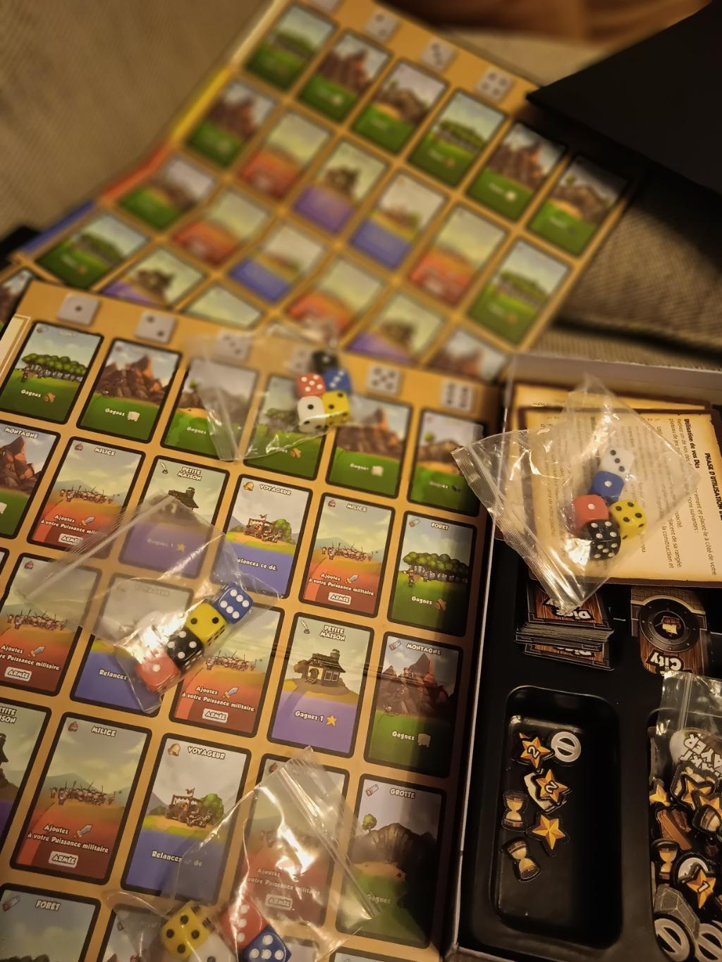 Jeu de ressources avec des Déserts avec 4 plateaux (1 par joueur), 20 dés et de nombreuses cartes et pions.