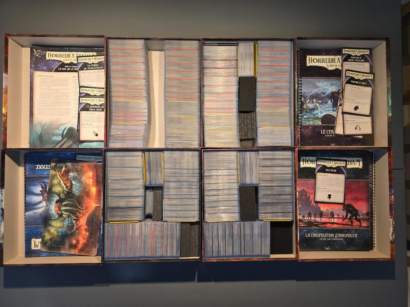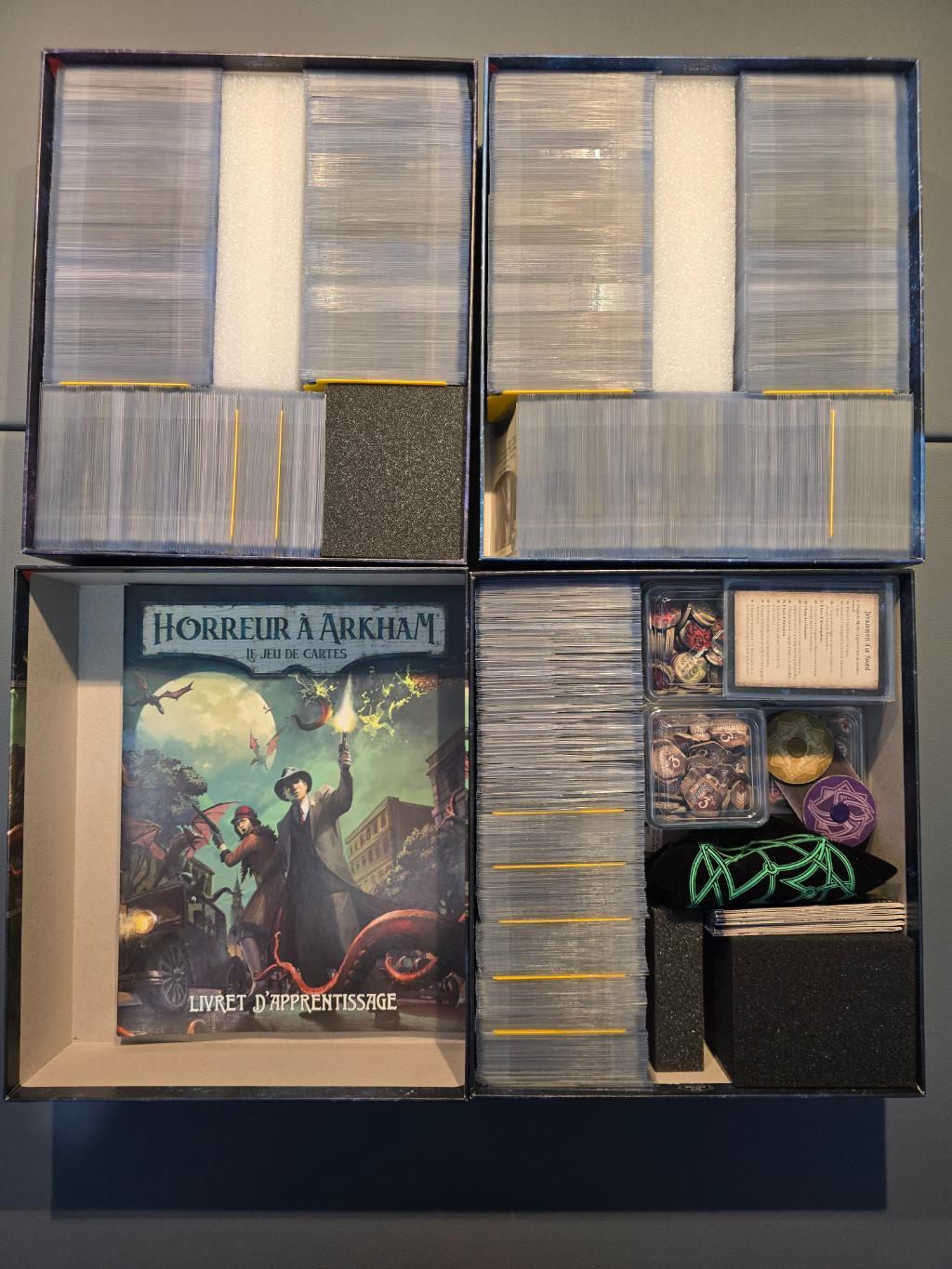 Le contenu est rangé dans 3 boites pour les cartes investigateurs et 4 pour les campagnes et scénarios afin de maximiser le rangement, ne vous inquiétez donc pas de voir des boites d'extensions vides lors de la réception.