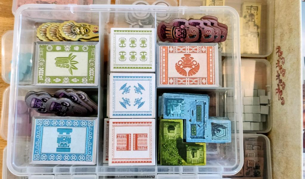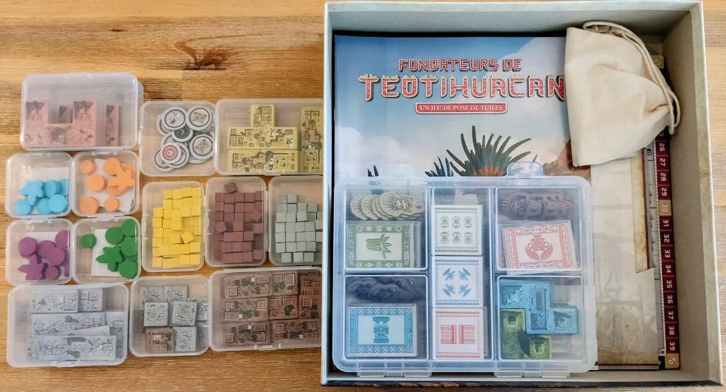 Il est vendu avec des rangements en plastique qui permettent d'organiser tout le matériel (tuiles, cubes en bois, etc.).