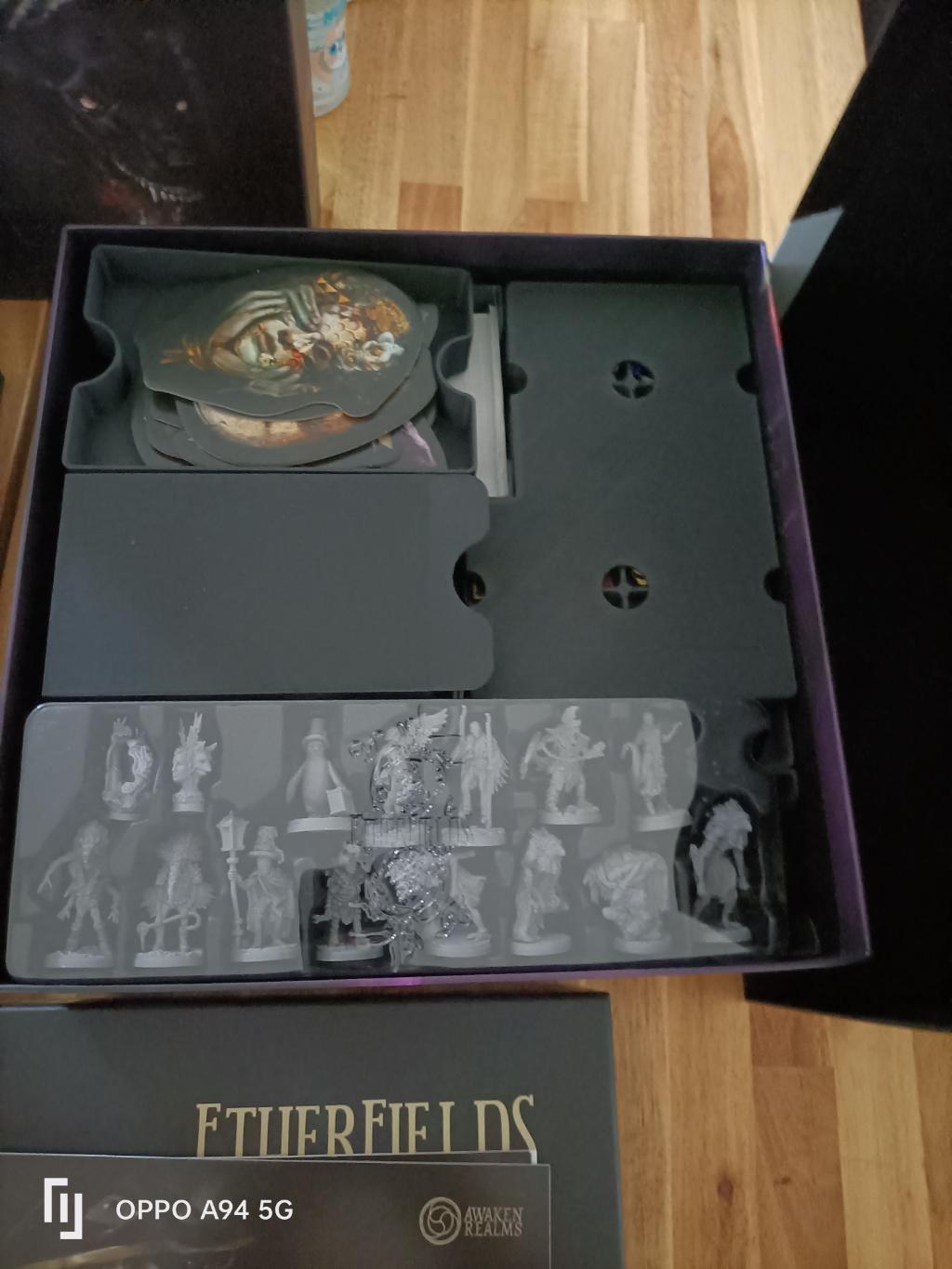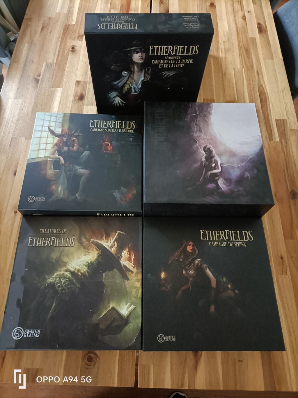 Boîte de base Etherfields (cette boîte ne m’est pas parvenue sous cello / Je l’ai juste ouverte – cf. photo – pour constater que les règles 2.0 avaient été sans doute ajoutées tout en haut)