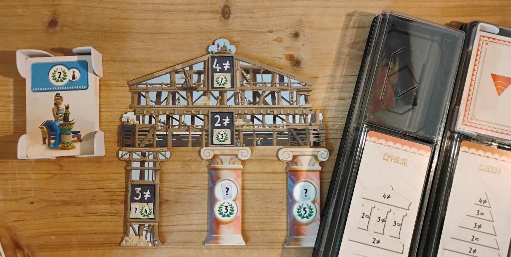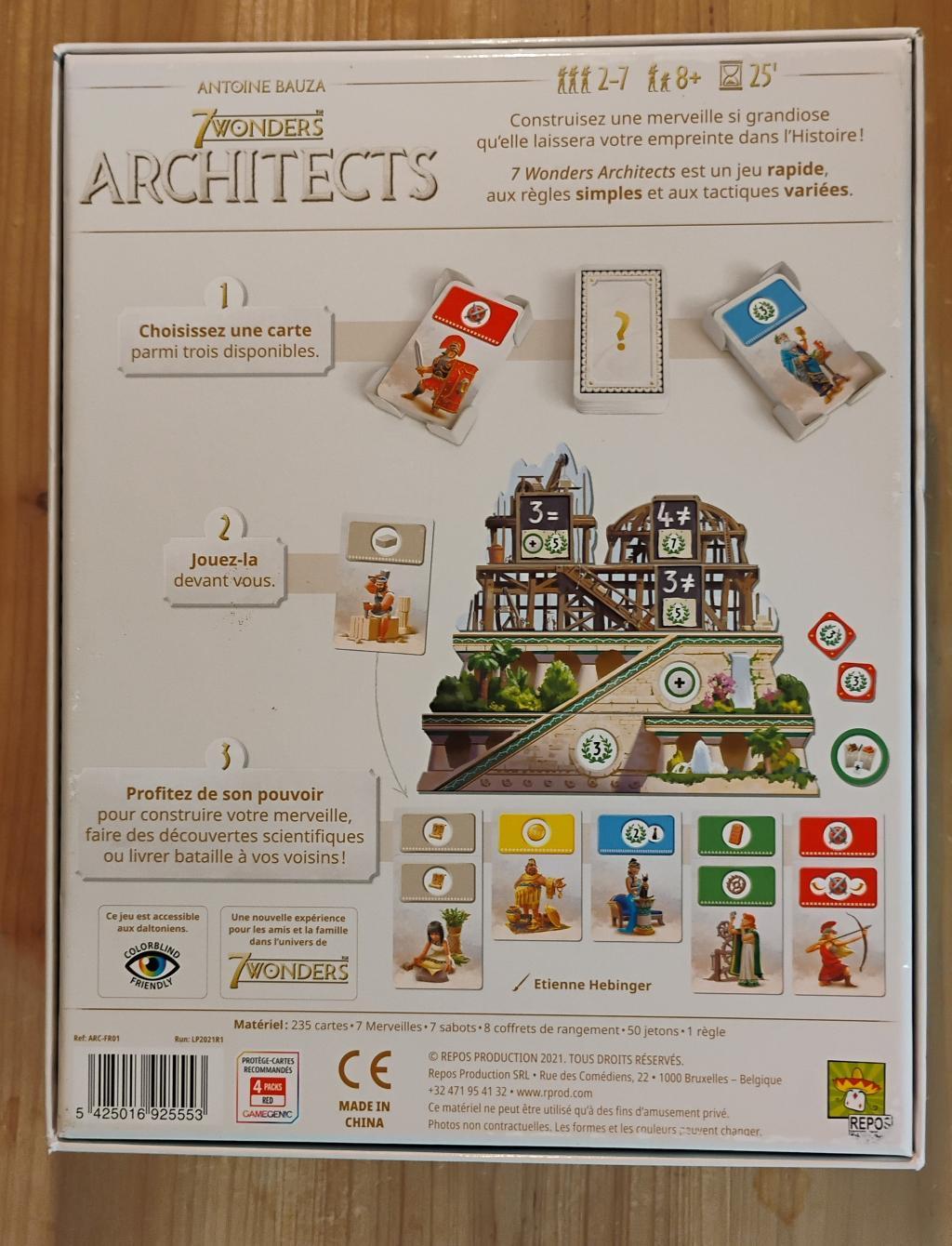 La version plus rapide et accessible du 7 wonders. On se concentre sur la merveille et il faut piocher stratégiquement dans l'une des pioches partagées avec ses voisins. Rangement très pratique à l'intérieur de la boîte pour moduler les parties jusqu'à 7 joueurs. Très bon état, quelques marques sur la boîte.