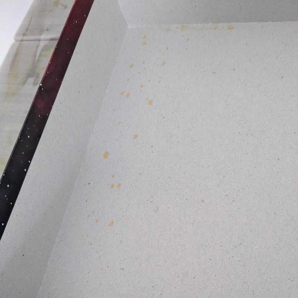 - La boîte a quelques défauts : dessus un peu incurvé, un poc dans un coin (voir photo), traces d'humidité à l'intérieur (voir autre photo).