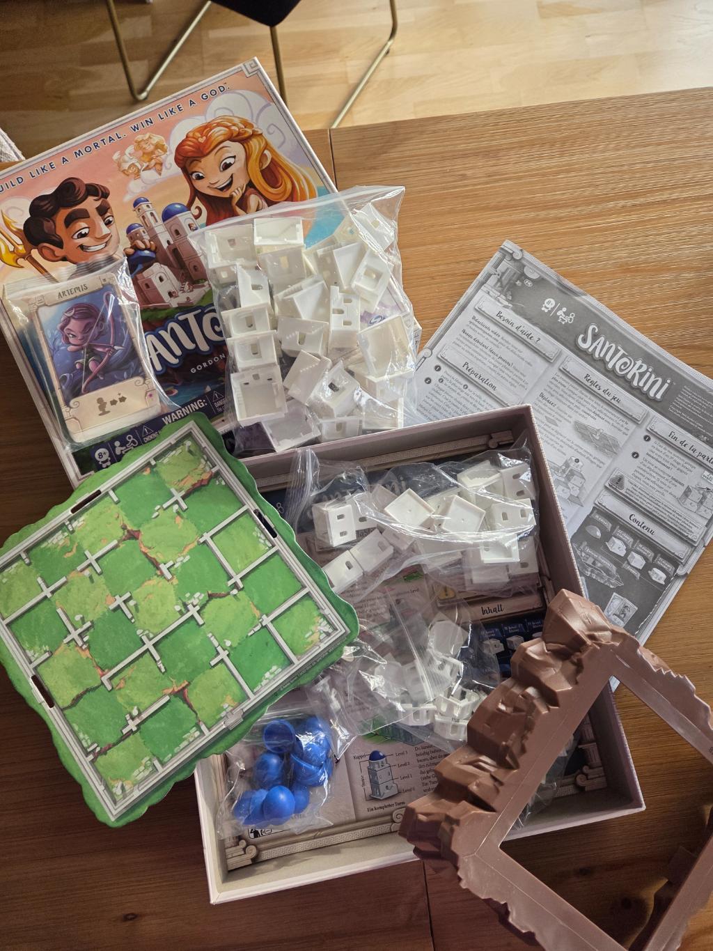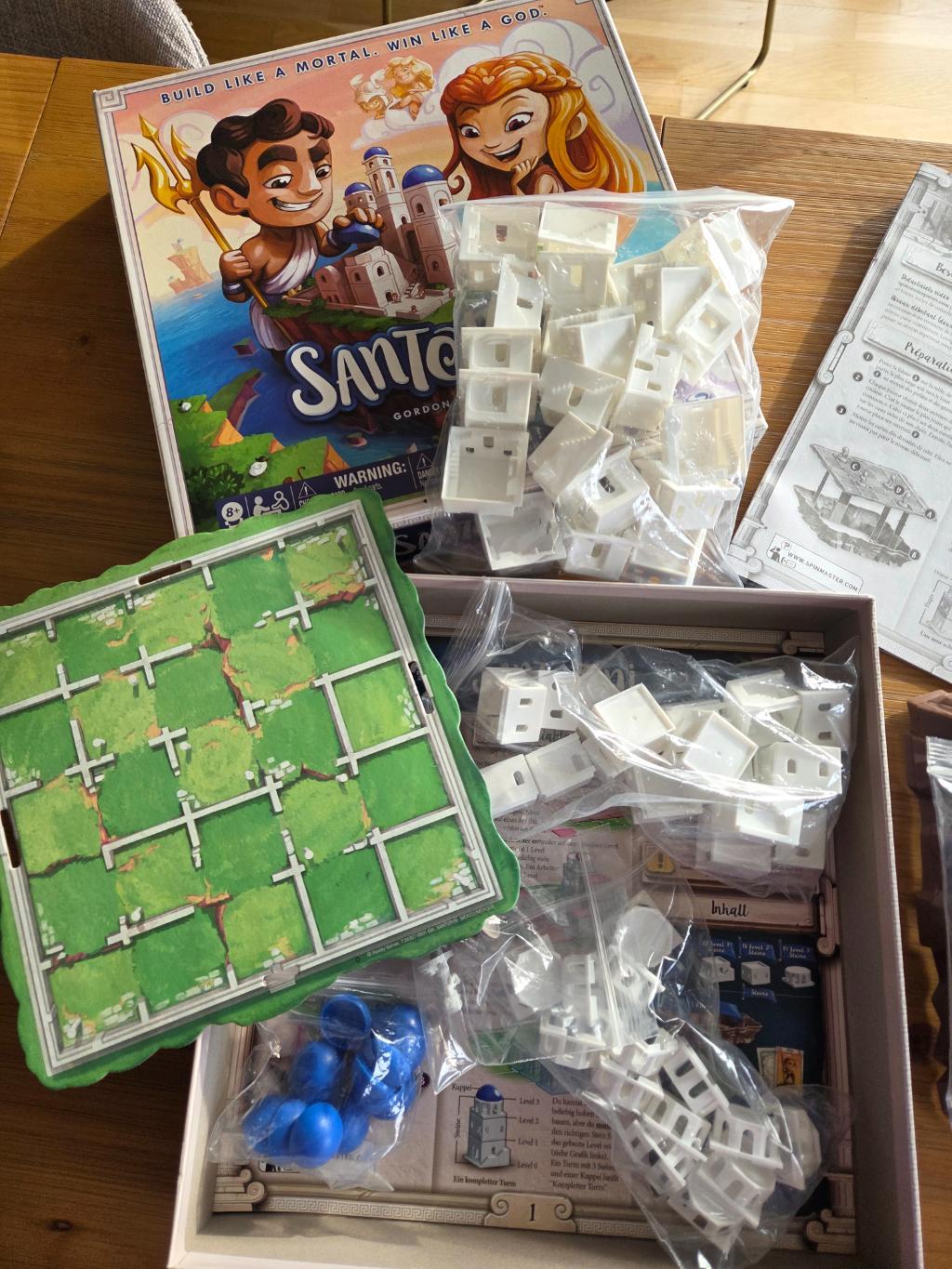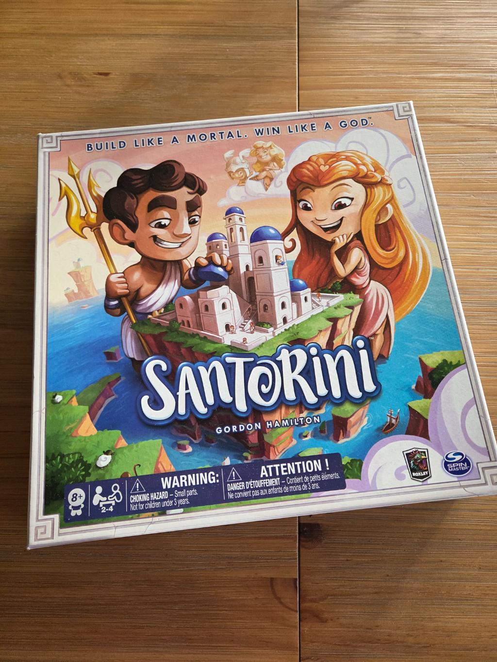 Santorini est un jeu qui allie simplicité et profondeur. Votre objectif, c’est de placer l’un de vos deux ouvriers au sommet d’un bâtiment. À chaque tour, vous devez en déplacer un et construire sur l’une des cases adjacentes un élément d’immeuble. Regardez une ville s’élever rapidement sur le plateau, à l’image de l’île de Santorin !