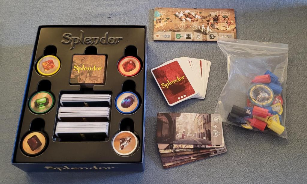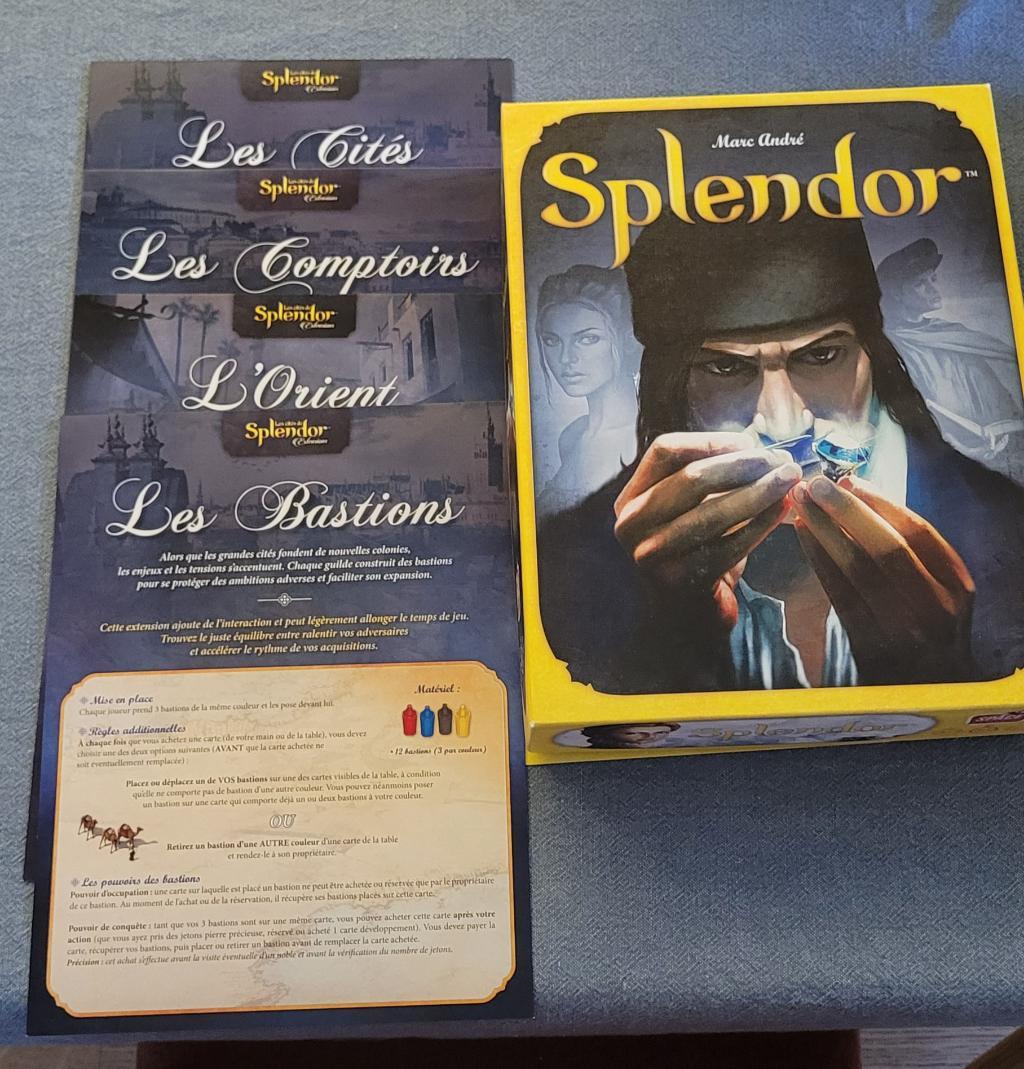 Jeu Splendor + extension "Les cités de Splendor". Le matériel de l'extension n'est plus dans sa boîte d'origine mais regroupé dans la boîte de base pour un gain de place.