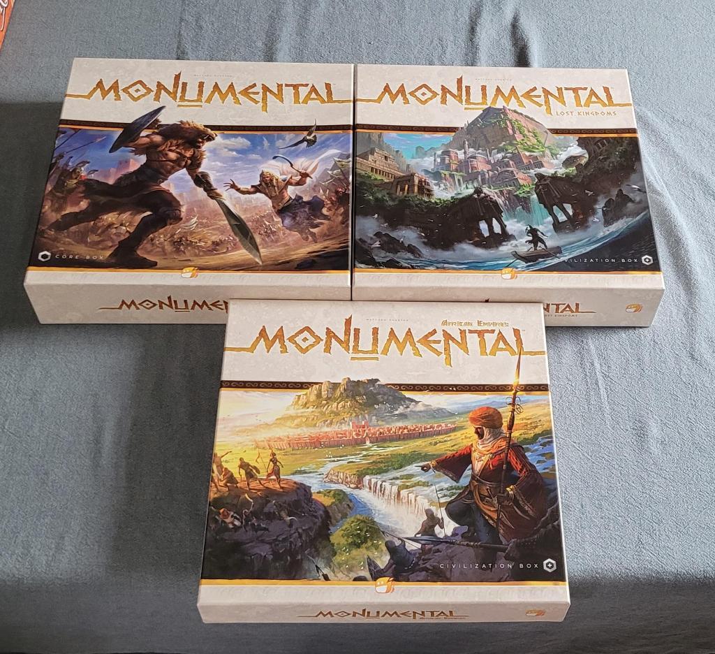 Jeu Monumental + extensions Lost Kingdoms et African Empires. Edition kickstarter (sans figurine). Jeux juste déballés.