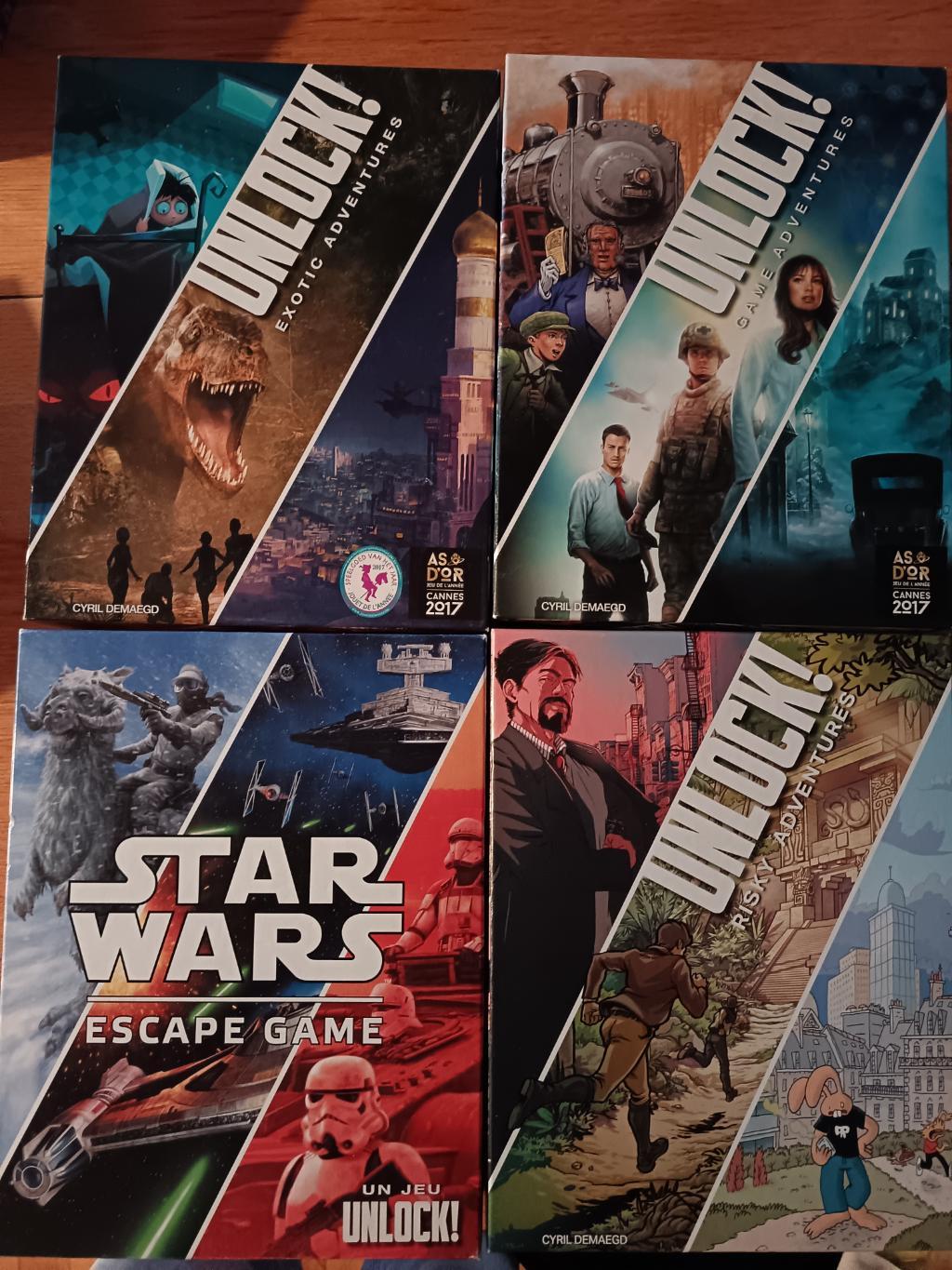 Je vends 5 boîtes unlock : Exotic adventures, risky adventures, game adventures, star wars, La formule.