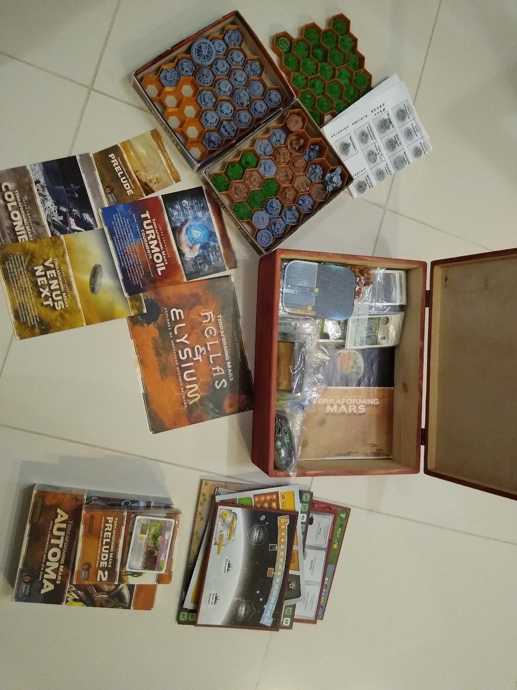 En bref presque toutes les extensions + batiments impression 3D custom + plateaux joueurs double épaisseur (incomparables pour tenir les cubes en place !)