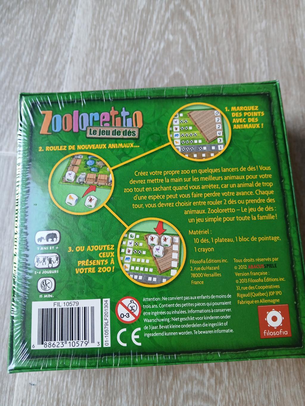 Creer un zoo identique pour chaque joueur. Il va falloir etre malin et choisir entre lancer les dés et placer les animaux dans les camions (et idéalement embetter les autres)ou prendre un camion. Jeu facile d’accès et dynamique sympathique !