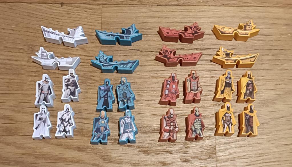 100 figurines avec stickers (recto et verso) . 15 vaisseaux et 10 agents par couleur (4 couleurs)