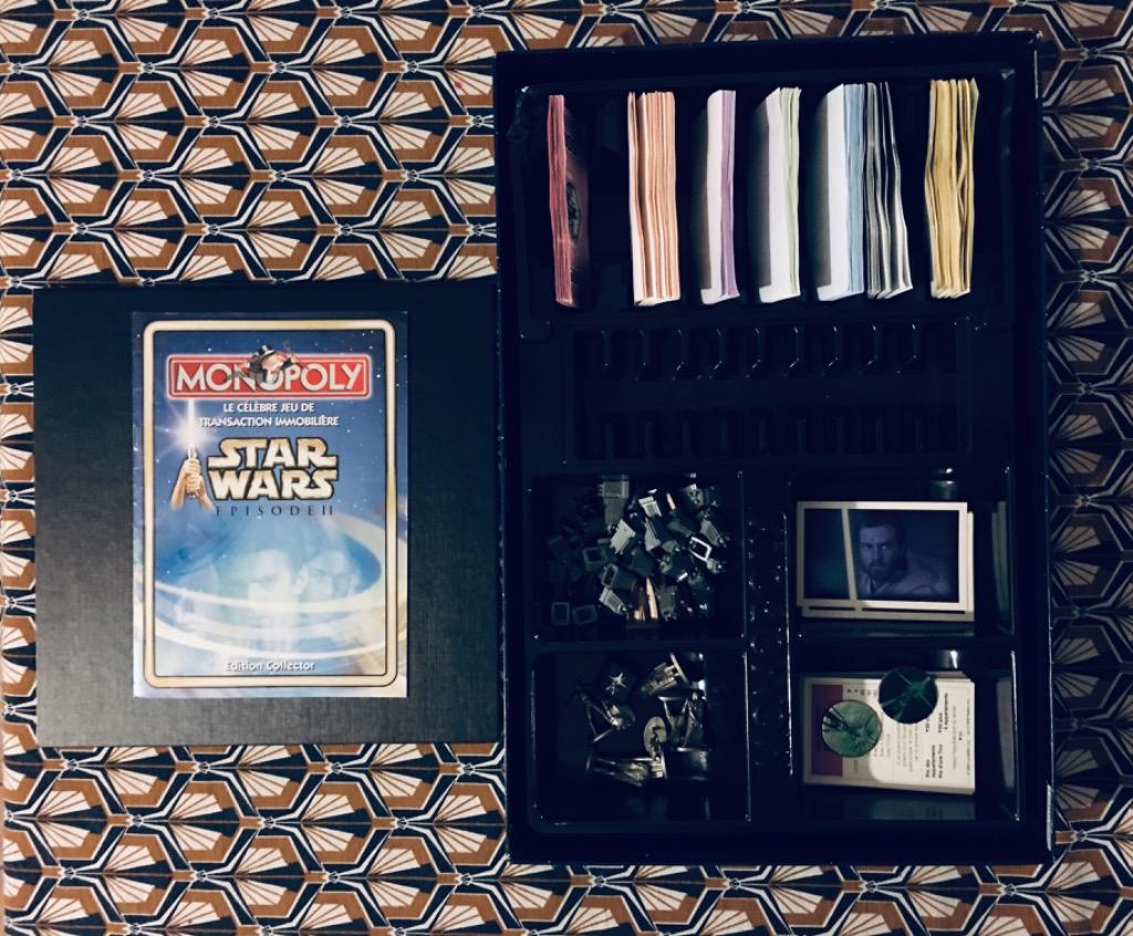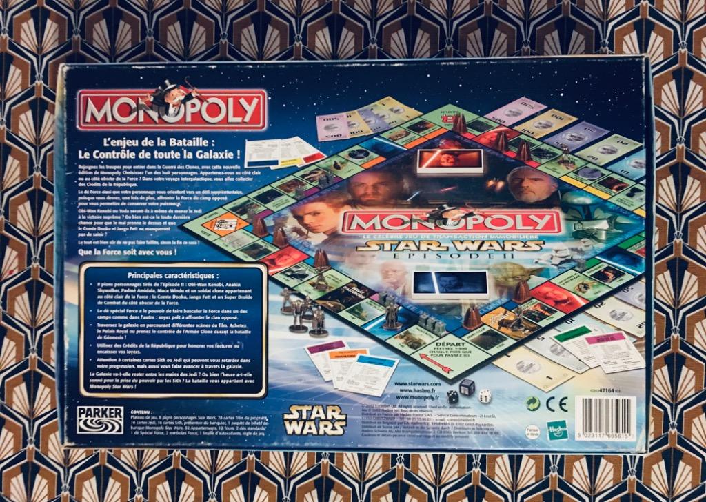 JeuVF, complet, matériel de jeu en bon état: les faces du dé de la Force ont été « perforées » pour numéroter les faces comme un dé classique ( … 😖) et les deux autres dés, noir et blanc, ne sont pas d’origine.