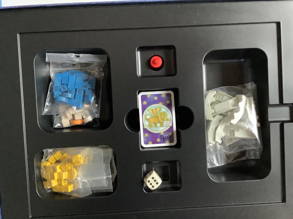 Le jeu provient d’une vente à une ludothèque. Le jeu est complet mais chaque pièce et carte sont marquées du numéro du jeu. Les cartes sont en bonne état. Le dessous du plateau est abîmé ( voir photo) suite au décollage de la protection plastique. Le côté jouable est relativement en bon état.