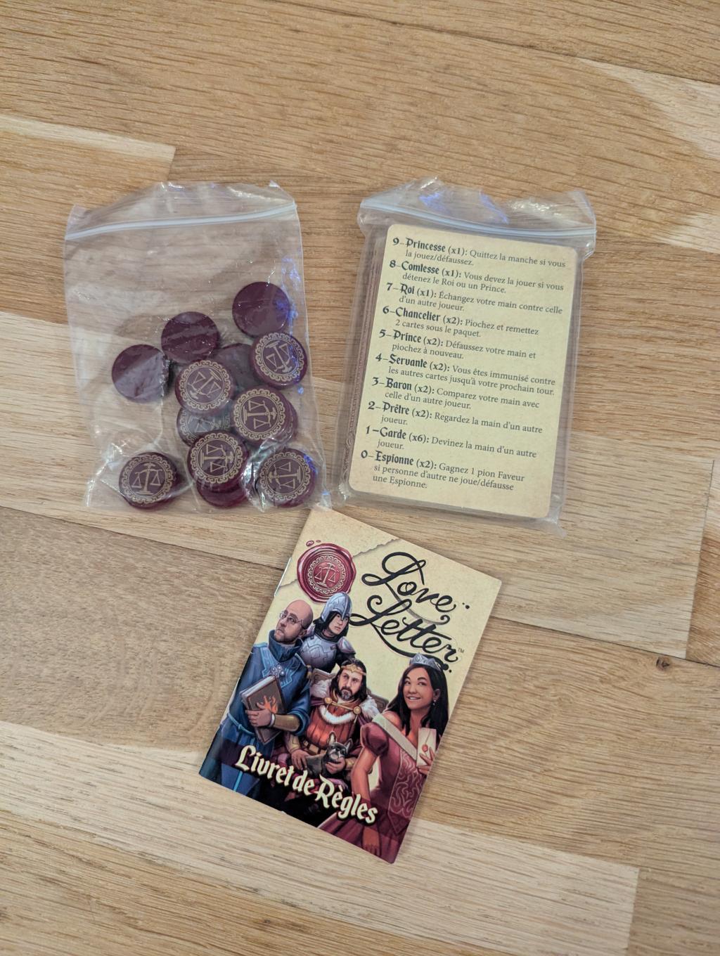 Votre but est de faire parvenir une lettre d’amour à la Princesse. Malheureusement, elle s’est enfermée dans le palais et vous dépendez d’intermédiaires pour livrer votre message. Durant la partie, vous conservez secrètement une carte en main. Il s’agit de la personne qui tient votre billet doux pour la Princesse. Vous devez vous assurer qu’à la fin de la journée, la personne la plus proche de la Princesse ait en main votre message !