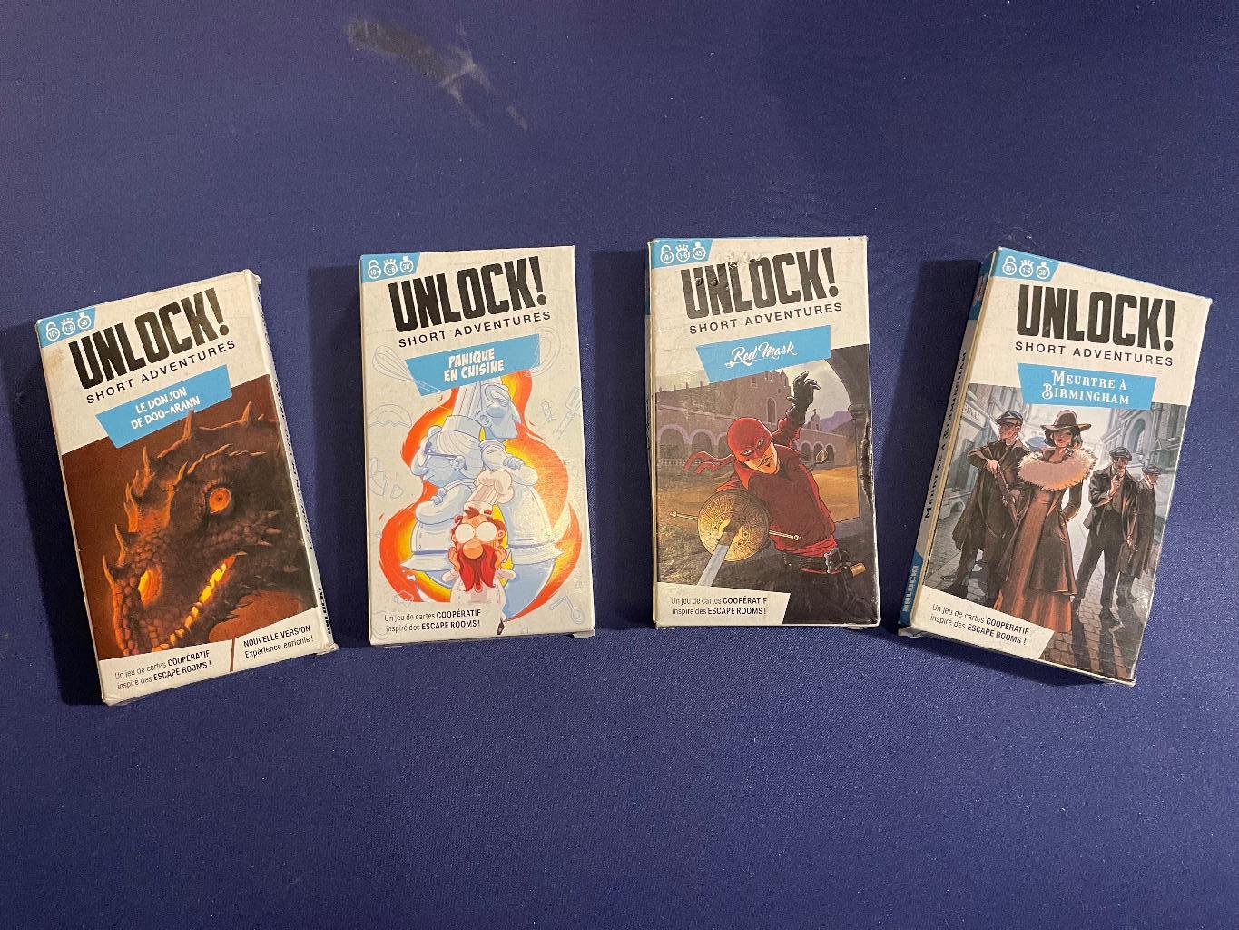 4 Unlock ! Short : Le donjon de Doo-Arann / Panique en cuisine / Meurtre à Birmingham / Red mask (qui a la pochette et quelques cartes abimée)
