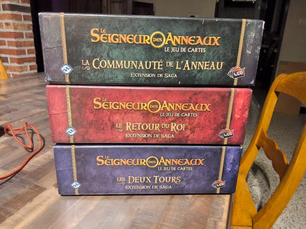 | 03/11/2025 20:16 | Description | Je vends les 3 extensions de saga pour le seigneur des anneaux jce: la communauté de l'anneau, le retour du rois et les 2 tours. Toutes les cartes ont été sleevées dès le départ (je laisse les sleeves). Seule la campagne de la première boite a été jouée. Les cartes campagnes du retour du roi sont encore emballées. La boite de la communauté de l'anneau à quelques traces d'usure sur les côté, mais les cartes sont intactes. Prix pour une boite: 45 euros Prix pour 2 boites: 80 euros Prix pour les 3 boites: 100 euros Priorité à la personne qui prend les 3 . Retrait possible à mon domicile près de Ath. Envoi possible via mondial relay, frais de port à votre charge. |