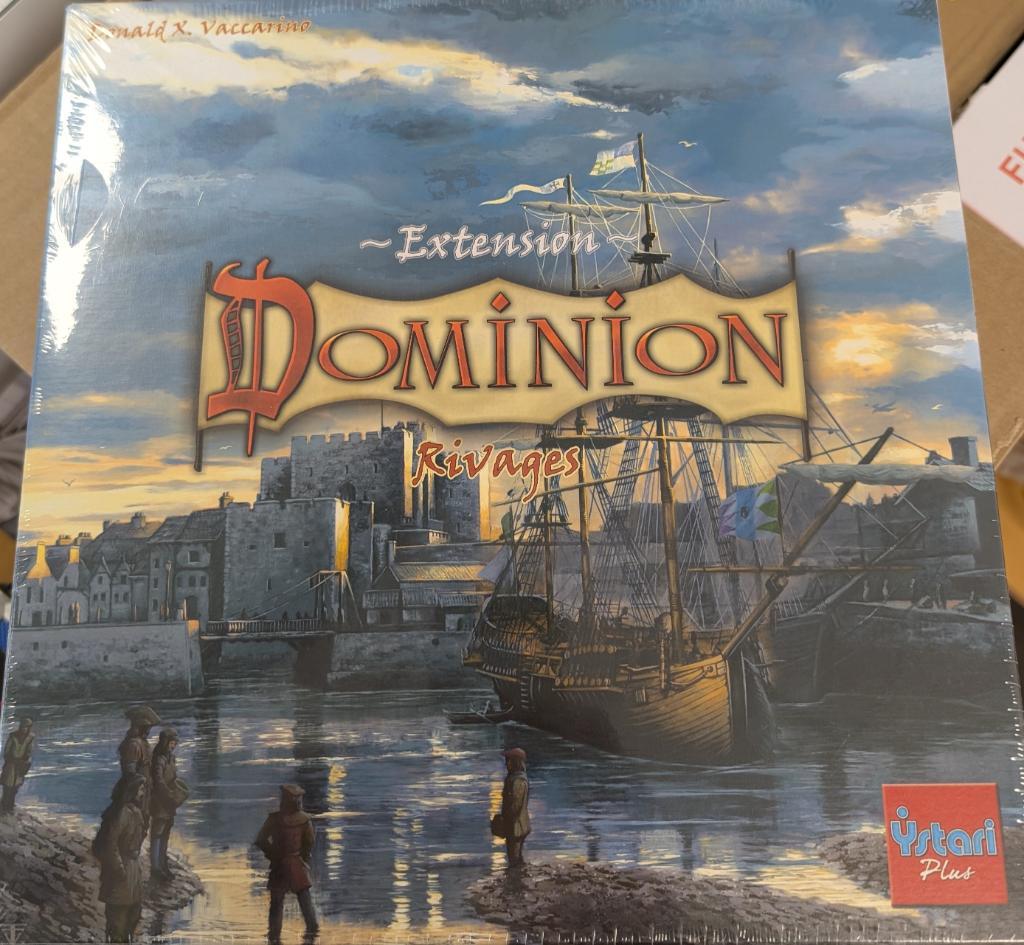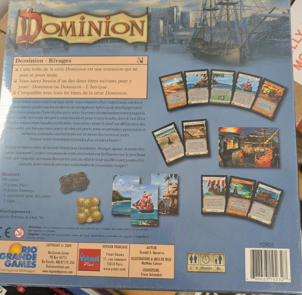 Vous n'avez qu'un seul et unique désir; vous emparer d'un majestueux navire et vous laisser guider par les étoiles et un navigateur. Après avoir développé votre Dominion jusqu'au fleuve le plus près, votre horizon s'étend maintenant jusqu'à la mer. Au loin se trouve des ports marchands et pour vous y rendre, dans le but d'établir des routes marchandes profitables, vous devez poser le pied sur différentes îles. Vous savez que lorsque vous aurez atteint ces ports vous en prendrez possession et arriverez à étendre vos horizons sur de nouvelles terres et mers. Un jour, votre Dominion s'étendra d'un océan à l'autre. Voici le troisième titre de la série Dominion. Dominion - Rivages ajoute 26 nouvelles carte royaume. L'aspect novateur de cette extension est l'influence sur le prochain tour: une majorité de nouvelle cartes ont un effet le tour qu'elles sont jouées et le tour suivant. Serez-vous le premier à atteindre de nouveaux rivages? Matériel: -300 cartes. -25 jetons pièces -15 jetons embargo -18 plateaux individuels -1 séparateur de cartes -1 règle